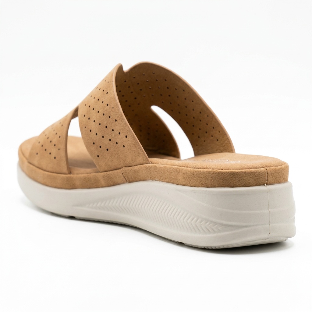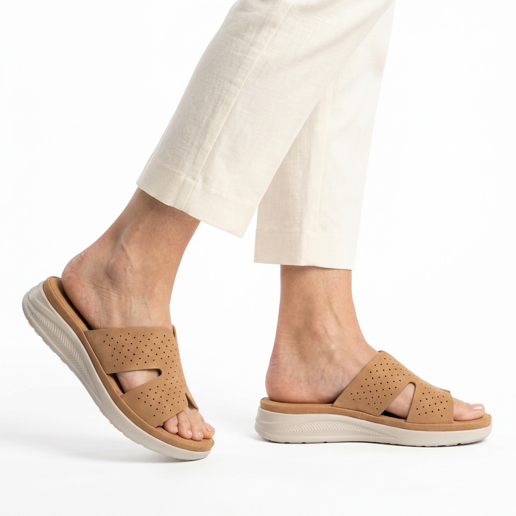 Ανακαλύψτε την άνεση και το στυλ με τα γυναικεία ανατομικά παπούτσια σε tan απόχρωση. Διαθέτουν διατρήσεις για αερισμό, slip-on σχεδιασμό, λευκή σόλα και wedge τακούνι για επιπλέον στήριξη.
